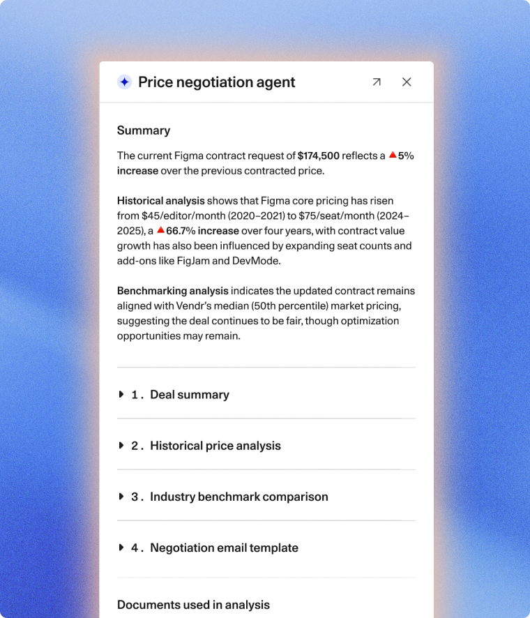 The Price Negotiation Agent changes that dynamic by leveraging industry data which now includes Vendr software market intelligence to analyze both internal purchase history and external market benchmarks to provide data-backed negotiation guidance.