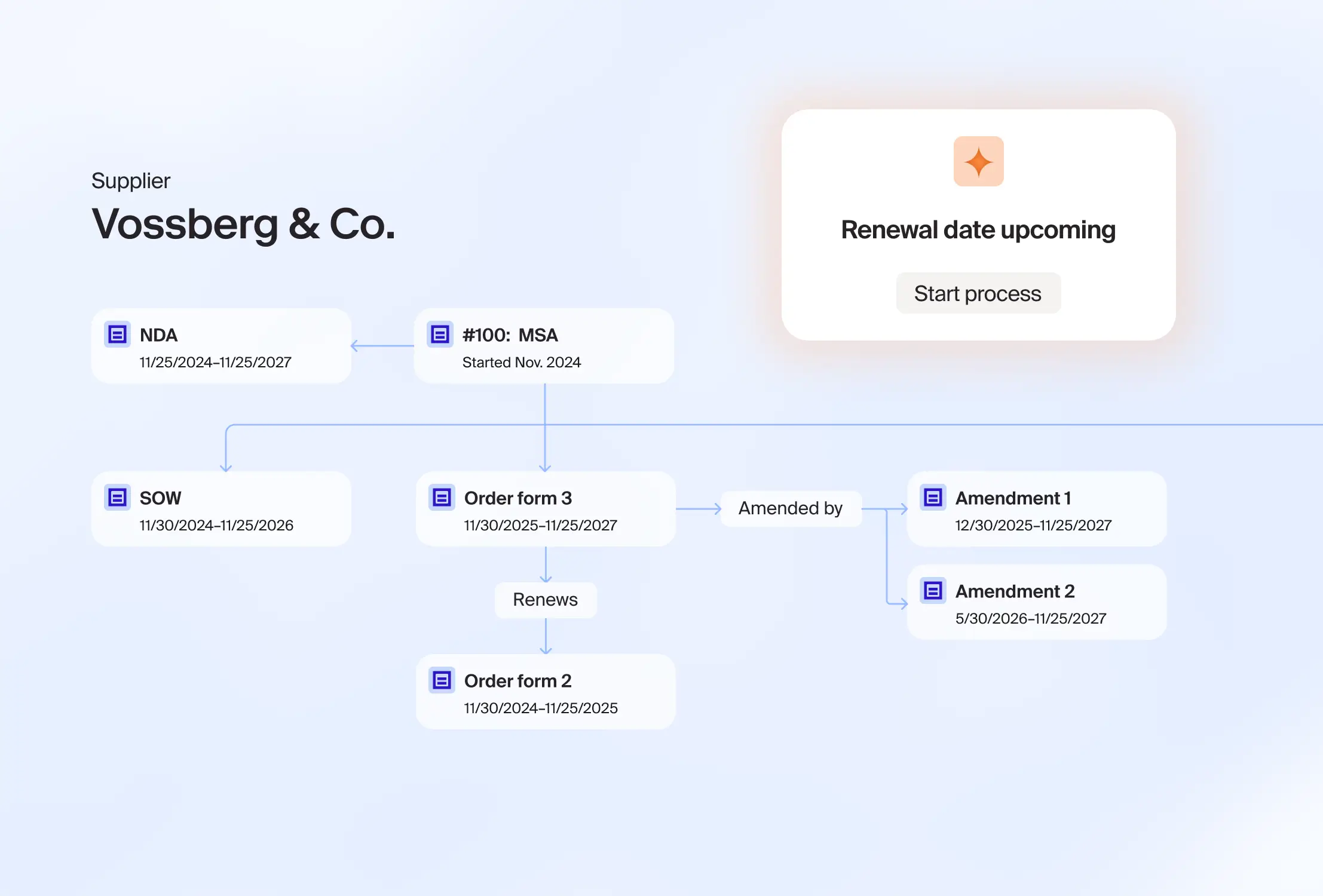 Automatically link amendments, SOWs, and parent agreements into a clear contract family tree with renewal alerts to stay on top of key dates.